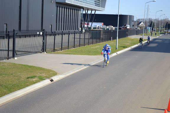 Zondag won ik in Doetinchem de finale-wedstrijd van de SIJC-Voorjaarscompetitie in de A-klasse. Al vrij snel ontstond er een kopgroep van 6 man, die na een half uur goed samenwerken het peloton dubbelde. Tijdens het afsprinten van het peloton besloten enkele renners vlak achter mij het asfalt eens van dichtbij te bestuderen. Samen met een andere attente koploper wist ik aan deze racefiets-domino te ontkomen. Ik vermoede dat ik na 4 weken zonder trainen te weinig power zou hebben voor mijn handelsmerk -een demarrage in de laatste 3 kilometer- en besloot op de sprint te gokken. Mijn metgezel dacht er blijkbaar net zo over. Pas op 200meter voor de streep ging ik van kop af aan en wist hem in een spannende spurt nipt te kloppen.